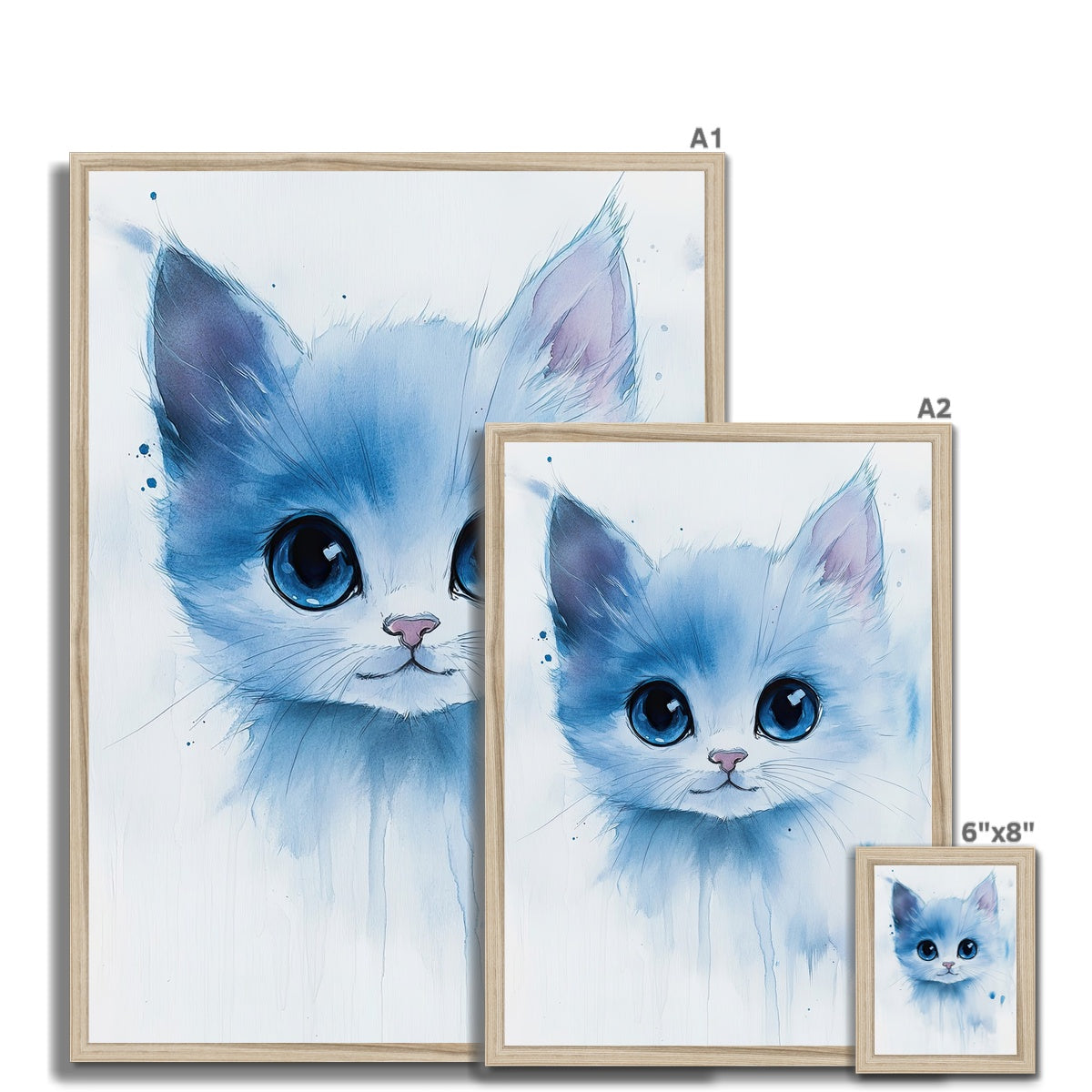 "Azure Whiskers" watercolor art print in the style of delicate ink washes Framed Print