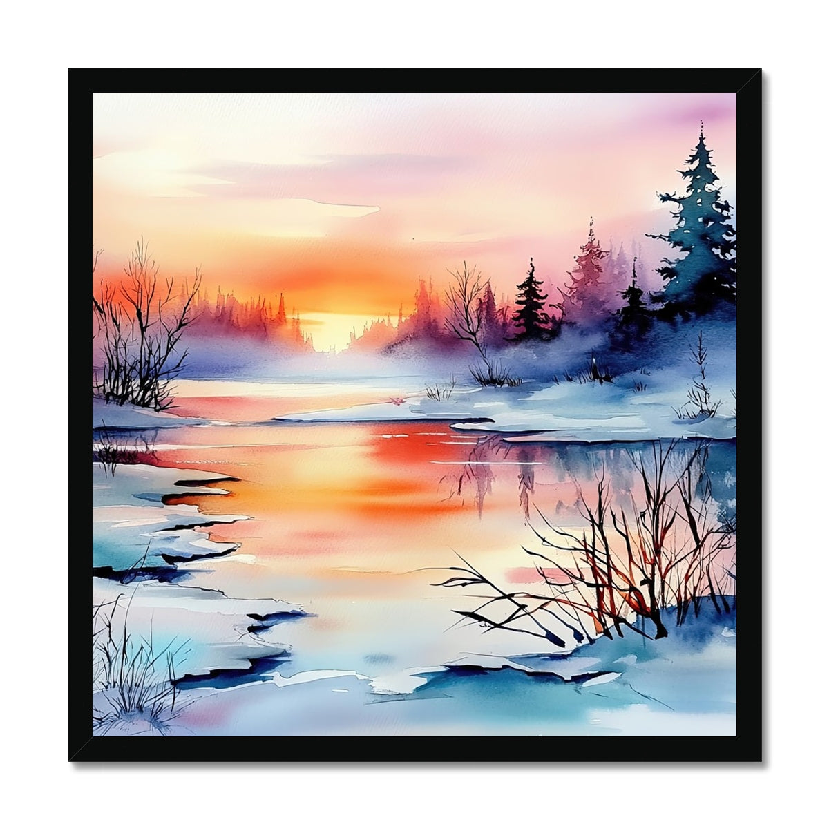 "Winter’s Reflection" impressionist art print in watercolor Framed Print
